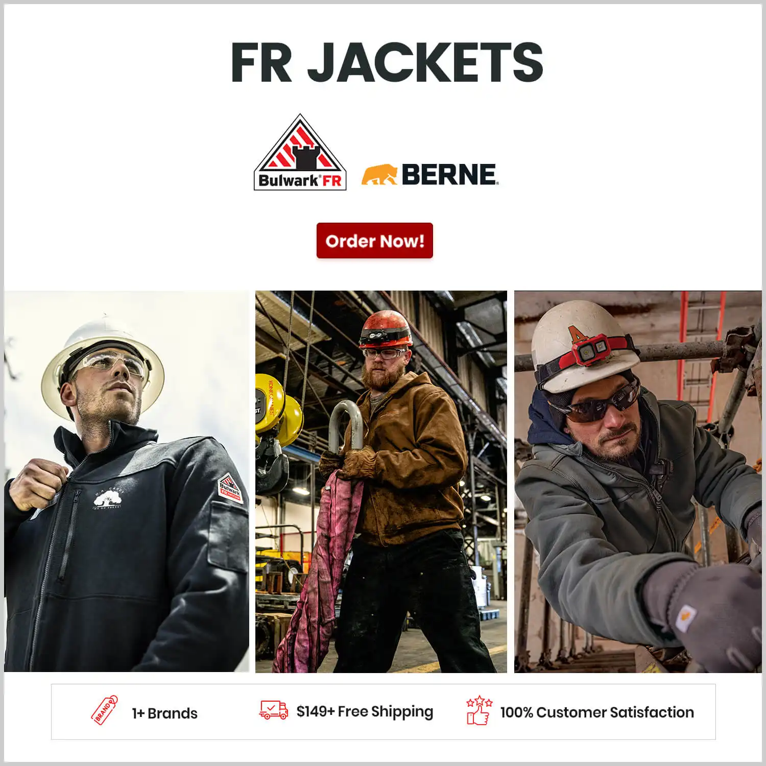 Shop the best-selling FR work coat like the Bulwark KEW2 Men’s Work Coat, FR insulated coat like Bulwark JLC4 Men’s Lineman’s Coat, or Bulwark JLC4L Men’s Brown Duck Lineman’s Coat. All of our fire resistant coats are designed for tough field conditions and extended shifts throughout winter season. Style them over FR shirts and FR coveralls by pairing them with flame resistant pants to add an extra layer of warmth and protection in outdoor and high-risk environments. Each style meets OSHA and NFPA safety standards, so your team stays compliant, protected, and ready to work with confidence all day. Check out our selection and place your orders for fire retardant coats today. We are committed to deliver your orders exceptionally fast across the United States.